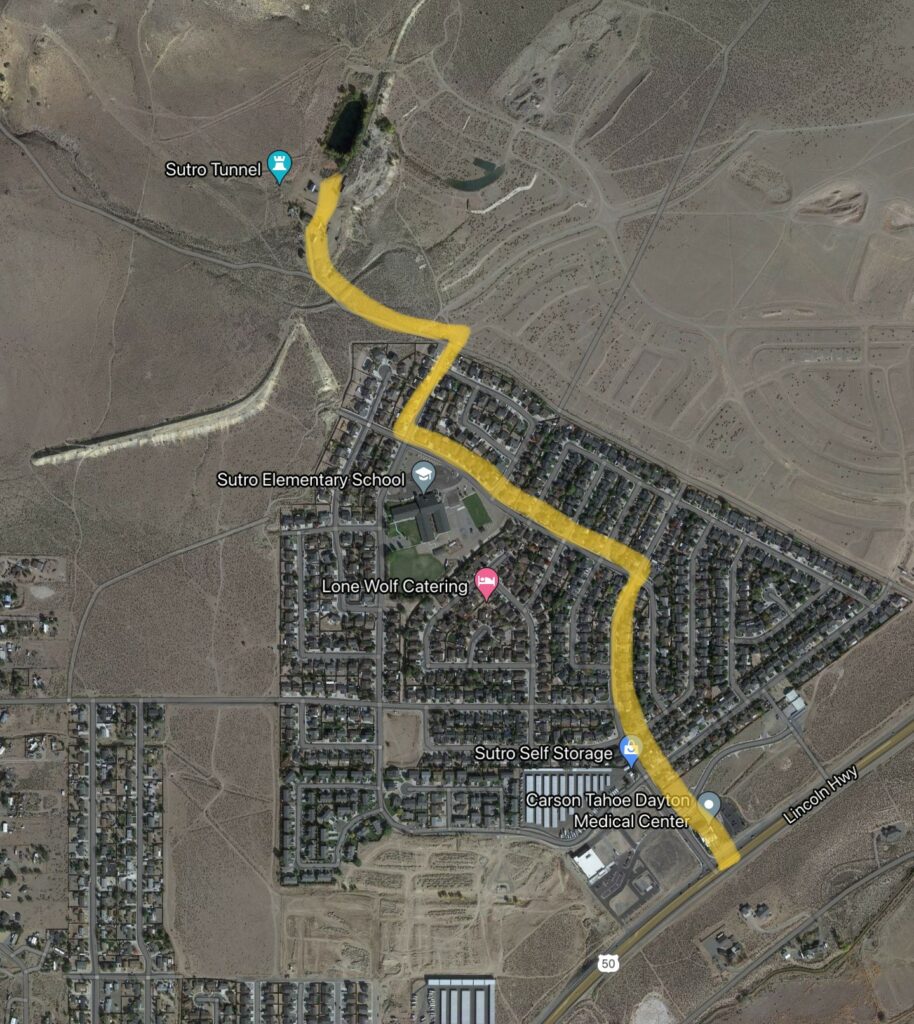 Once you’re on Fortune Drive, drive slowly until you reach Sugarloaf Drive. Take a LEFT on Sugarloaf Drive, then a RIGHT on Dayton Valley Parkway. When you run out of pavement make a LEFT on the dirt road (known as Sutro Tunnel Rd). The entrance is directly ahead. Google Maps Location