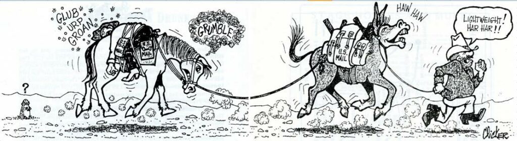 “Streeper tells this story in the interview, which kind of sounds like a Clampertale: Carrying both Pony Mail and Mule Mail came about because of “whiskey, a bad dose of it. Well, out there in Nevada some fellow set up a saloon near one of the stations. One day I noticed the horse of a Pony rider tied in front, so I stopped and went in.”” ‘Hello, Bill, Old Boy,’ the rider kind of slurred. ‘Come have a drink.’ ”