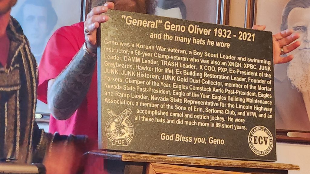 Geno was very active in E Clampus Vitus, a fun, frolicking, historical organization, becoming a Noble Grand Humbug of Virginia City’s Julia C Bulette Chapter. While Humbug, he founded J.u.n.k.—Julia’s Unequivocal Nevada Klampouts. This special event was designed to make overnight treks to historic sites throughout Nevada. A docent for the Nevada Historical Society, Geno was passionate about Nevada history. He researched and wrote the history for almost every JUNK Trip.