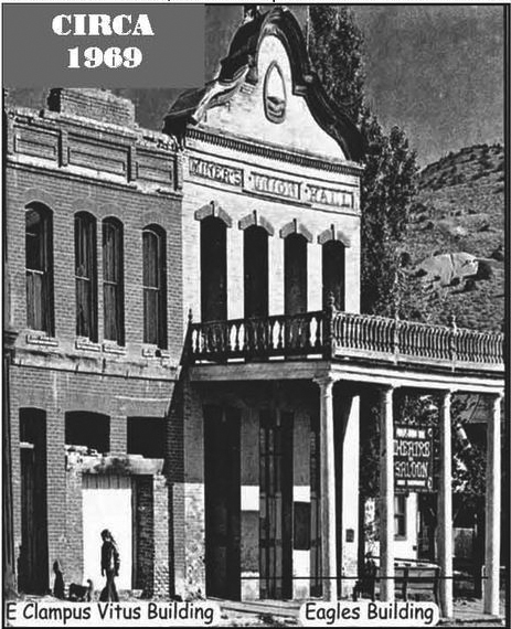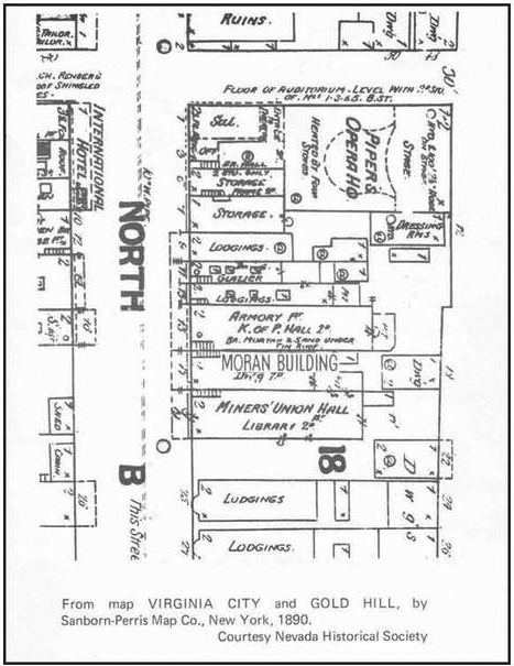 In Virginia City, between the Knights of Pythias Hall and the Miners Union Hall, there was a long, narrow piece of land with ruins which included a single row of brick for a front wall and a cliff up to A Street in the rear. No side walls existed. Previously, a roof was suspended from the buildings on both sides.