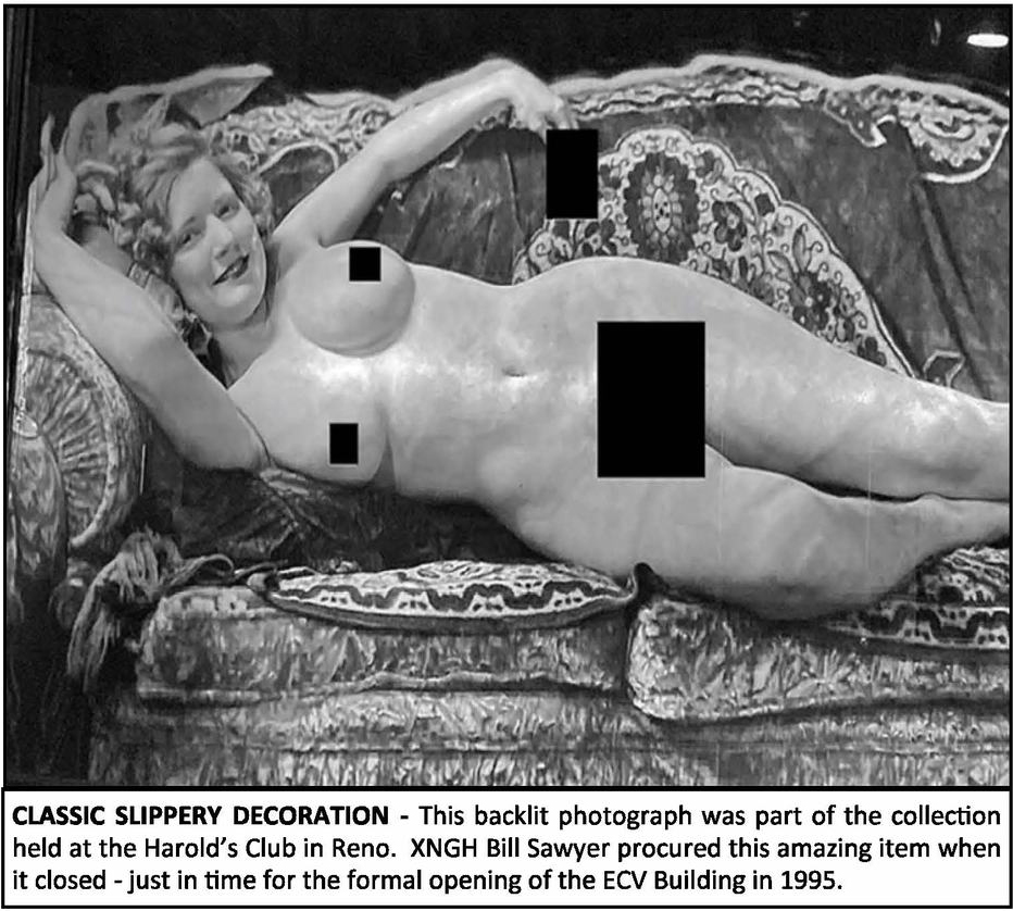 It was finally time for the first formal event, hosted by NGH Bowers. The Widder’s were greeted in 1995 with a grand banquet in late-October near Nevada Day. The second-story bar was operational and the famous backlit artwork was in place. For Widder’s Balls, she is sometimes covered up with a makeshift bikini. This famous photographic piece behind the bar was procured by Bill Sawyer (NGH 1988) from the Har­old’s Club collection. While the club was open, Sawyer took care of the calliope and tuned pianos. He was also known for playing the tuba. [NOTE: In Virginia City, we have a Nevada Day Ball… because our Widders don’t have balls. –M]