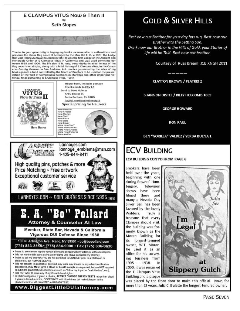 Smokers have been held over the years, beginning with one during Bowers’ Humbuggery. Television shows have been filmed there and many a Nevada Day Silver Ball has been favored by the lovely Widders. Truly a treasure that every Clamper should visit, the building was formerly known as the Moran Building for its longest-tenured owner, W.T. Moran. He used it as an office for his surveying business from 1905 –  1938.   In 2000, it was renamed the E Clampus Vitus Building and a plaque was placed by the front door to make this official. Now, for more than 52 years, Julia C. Bulette the longest-tenured owner.