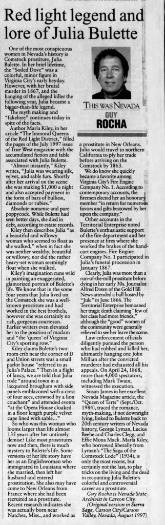 Comment from Ron James: “Guy abhorred the folkloric process that wove tentacles around the historical subjects of the West. His brand of “myth busting” became the sole reason behind his writing, but it discredited an essential aspect of what the West was – and is – all about, namely, the stories. Richard Dorson coined the term “fakelore” in 1950, and it was subsequently weaponized to destroy this part of western culture. Folklorists generally set aside Dorson’s term as no longer useful, but Guy never received that memo. I take up the Bulette story in my forthcoming book, Monumental Lies: Early Nevada Folklore of the Wild West, and I treat her metamorphosis into a folk heroine in my brief article: https://www.academia.edu/44495705/Sex_Murder_and_the_Myth_of_the_Wild_West_How_a_Soiled_Dove_Earned_a_Heart_of