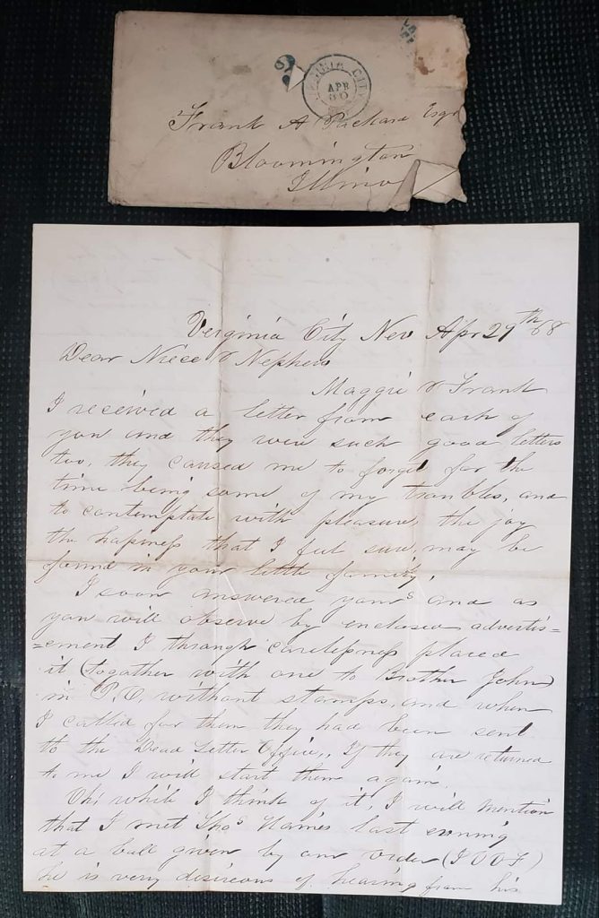 Here is a letter written in Virginia City by Samuel Baker to his niece and nephew April 29th 1868. The letter is incomplete. Wish I had all of it. Talks about a IOOF celebration , parade, Indian massacre and the hanging of John Millian….enjoy!