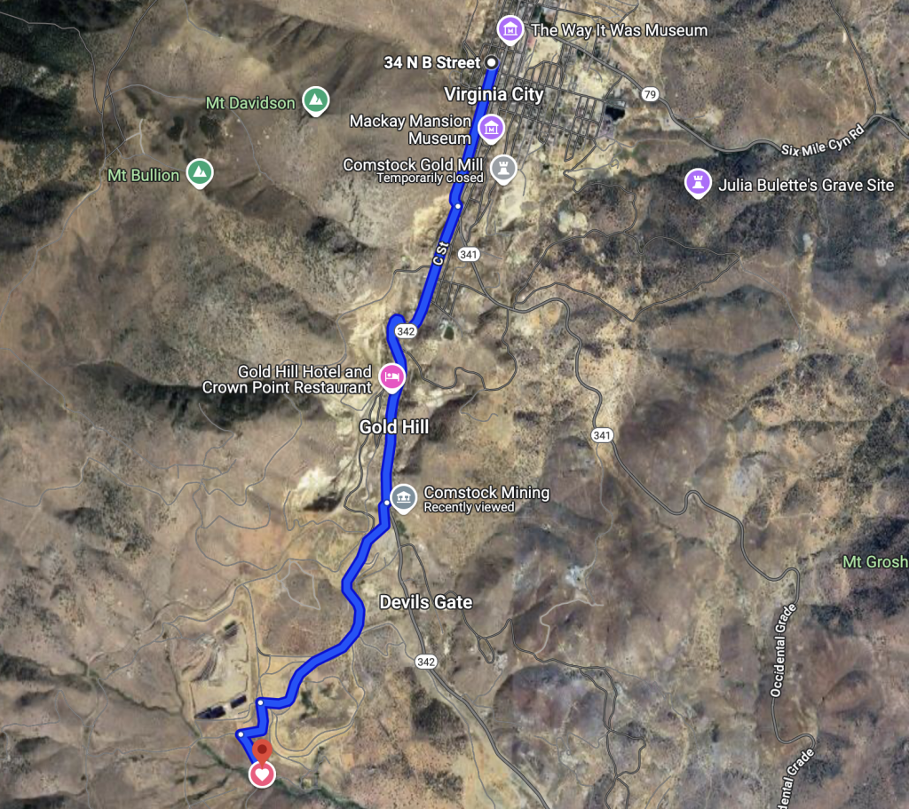 If you fit into any one of the categories of men mentioned above (no bull dykes allowed) you really should come to the Doins at this site, and stand, sit, or gracefully recline on the grounds of this historic place. While there is little to nothing to see of the old structures, the Officers of Julia C Bulette are conspiring together to put on a Doins worth remembering. The location is remote from the leering eyes of the general public, yet very easy to access.